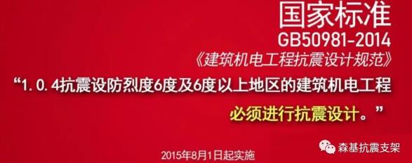 2014年10月9日,國家住房和城鄉(xiāng)建設(shè)部及國家質(zhì)量監(jiān)督檢驗檢疫總局正式頒布(建筑機電工程抗震設(shè)計規(guī)范)為國家標(biāo)準(zhǔn),編號:GB50981-2014,從2015年8月1日起強制執(zhí)行。