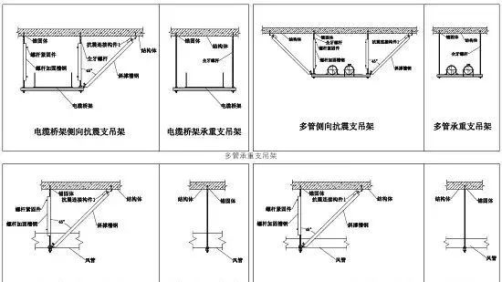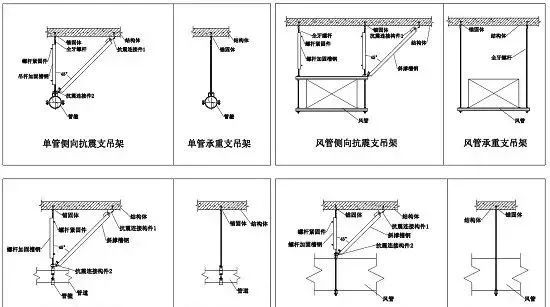 2.抗震支吊架的形式和承重支吊架一樣也有很多種,主要有:單管抗震支吊架、門型多管抗震支吊架、電氣系統(tǒng)管道抗震支吊架、風(fēng)管抗震支吊架、綜合管道抗震支吊架、及設(shè)備抗震支吊架等。